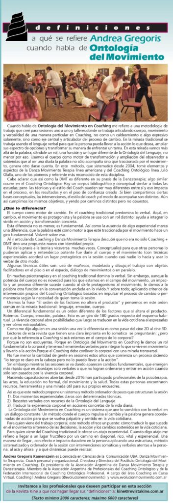 Hace mucho años que escribo MUCHO material en cursos presenciales, virtuales, en el Postítulo Coaching , Cuerpo y Ontología del Movimiento, pero acá en esta nota se me jugó algo diferente. Porque si bien he escrito para el exterior, para la Federacióin Internacional de Coaching y en idioma inglés, en esta revista se pone en juego mostrarse en la comunidad local de corporalistas que tienen líneas y abordajes conocidos y específicos.Tal vez porque algunos tienen prejuicios con el Coaching, y la verdad que hay algunos truchos que merecen que se creen estereotipos. Pero habemos otros que trabajamos de manera sólida y con resultados importantísimos para nuestros consultantes.